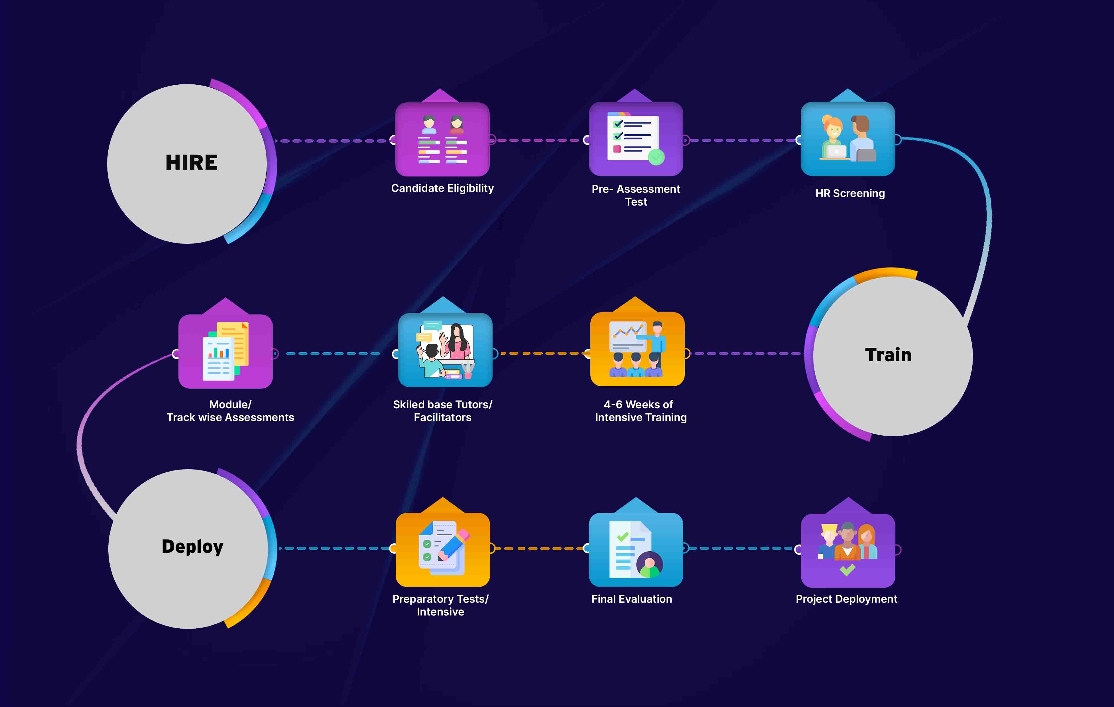 Hire-Train-Deploy is a form of recruitment program which has gained momentum in the recent past where-in Technology MNCs including Product and Services companies access Ready-to-Deploy/Project Ready fresh resources (Undergrads/Graduates) or Lateral Resources.